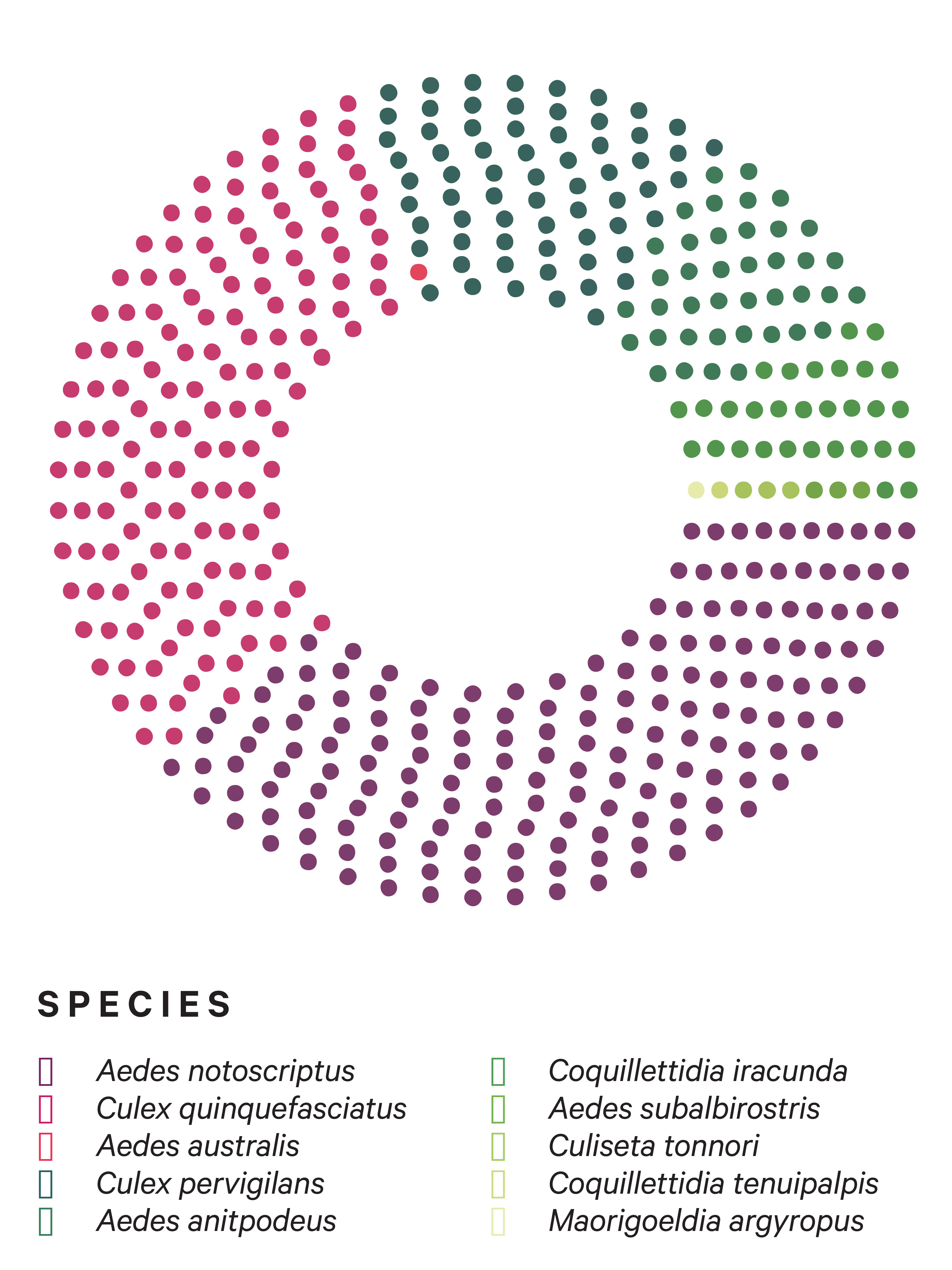 In 2019, scientists asked the public to catch and freeze mosquitoes, then post them to Te Papa. Over three years almost 900 tiny packages turned up. About a third of the insects weren’t mosquitoes at all, or they were too damaged (squashed?) to identify. Of the rest, two exotic species dominate. Julia Kasper, lead curator of invertebrates at Te Papa, says both are invasive and favour urban areas—and bite people—while our 13 native species, shown here in green, mostly prefer birds and deep bush. Two others, which she calls “the coolest mosquitoes in the world”, ducked the census entirely: Opifex fuscus breeds in rockpools, targets mammals and has a vicious bite. And Culex rotoruae breeds in hot, poisonous thermal pools—the only mosquito known to do so.