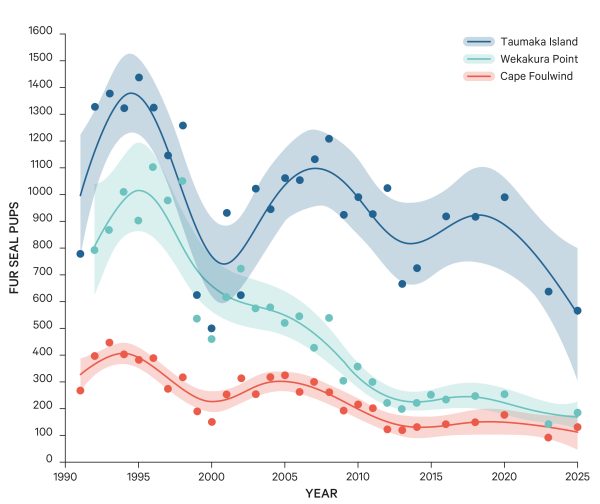 We know this only because of 34 years of dedicated monitoring by DOC scientists and mana whenua: annual or biennial trips to these remote locations, often by helicopter, to mark and recount pups. “It’s the longest continuous monitoring of fur seal populations anywhere in the country.”