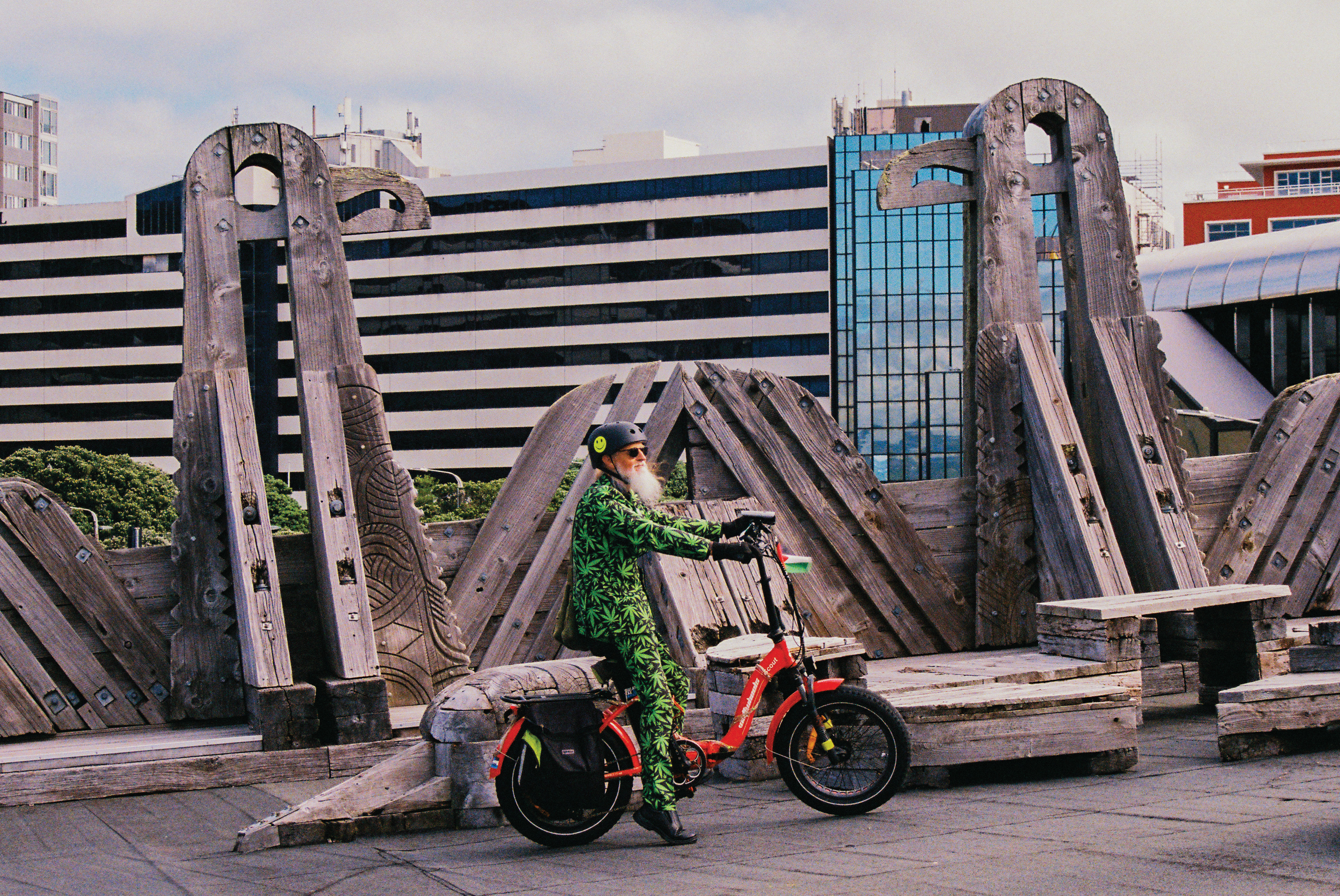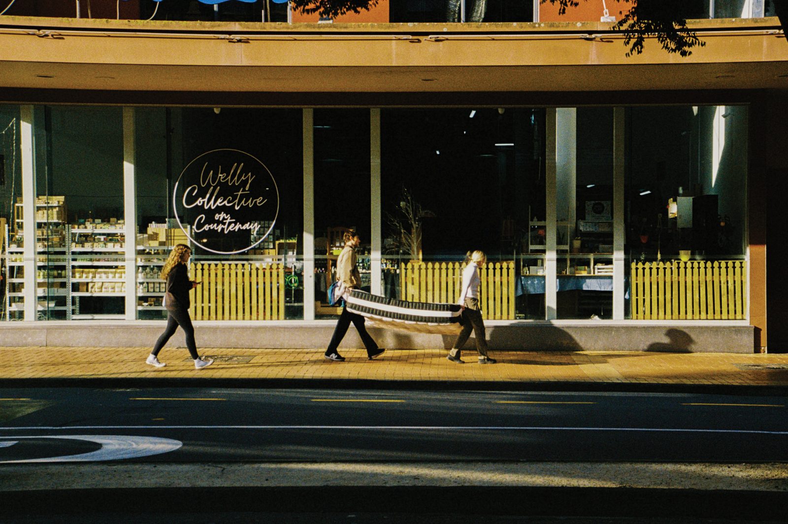 And at street level, things can look different. People still live in and love this city. They bike to work in a blinding northerly, following the curves of Evans Bay Parade; they schlep up Cuba Street with their mates, ducking in and out of cult favourites Cosmic or Iko Iko; they wait for an early-morning train to the Hutt Valley after being out all night. Workmen, couples on lunch dates, hardy protesters, families out for a stroll, someone popping down the road in their PJs; Wellingtonians, living their best lives.