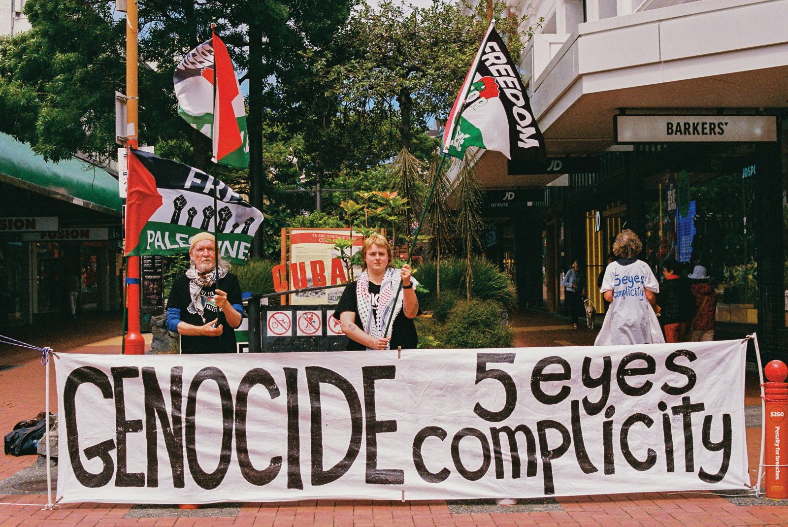 Further down Cuba Street, Eamonn King, 66, waves a flag, music pumping from a speaker behind him. Originally from Galway, he’s been part of the Palestine protest movement since the 1980s and is holding the line today with Lili Norman, who studies mental health and addictions at Massey University. “The Irish really understand what is happening in Palestine, and New Zealand is slow to pick it up,” he says. He’s been protesting all over the city with groups Occupy Brandon St and Justice for Palestine, including outside the Israeli Embassy and on the Hill Street motorway overbridge. “It’s really nice that it’s sunny today, because it has been pretty miserable over winter,” King says. “We’re just handing out information; we’re not aggressive. I had to do something, and I’m semi-retired so I’ve got time on my hands.”