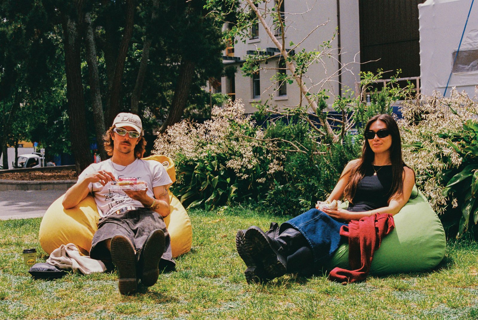 Louis Elorfi Macalister approaches the pair on a Friday lunchtime, and chats easily as he kneels in the grass with his Canon EOS-1. Four frames and he’s done: a wide shot, Walker lifting sushi to his mouth, Bush behind her sunnies, a close-up of Walker’s bejewelled knuckles. That’s all it takes, and that’s all he’s got—Macalister only shoots stills on film. He never goes back and re-shoots, and he doesn’t know what he’s got until the film’s developed. He likes it that way, saying it makes the whole thing seem more ephemeral, magic. “I like the slow process of it, and I feel like it’s the most true to life you can get,” he says.