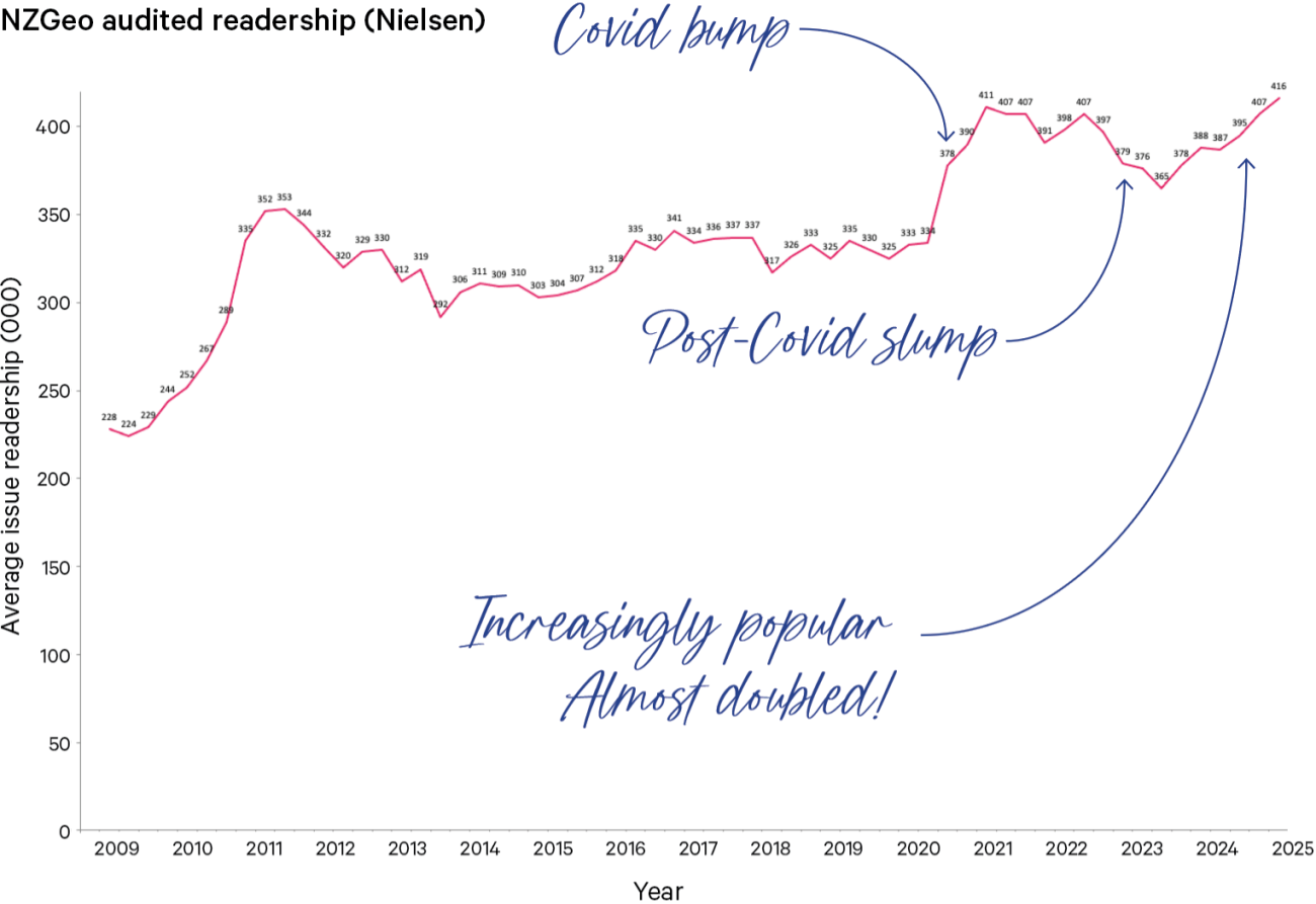 While other magazines have experienced cliff-like declines in readership over the past 15 years, New Zealand Geographic has grown. In fact, our readership has almost doubled in that period—an indicator of increasing relevance.