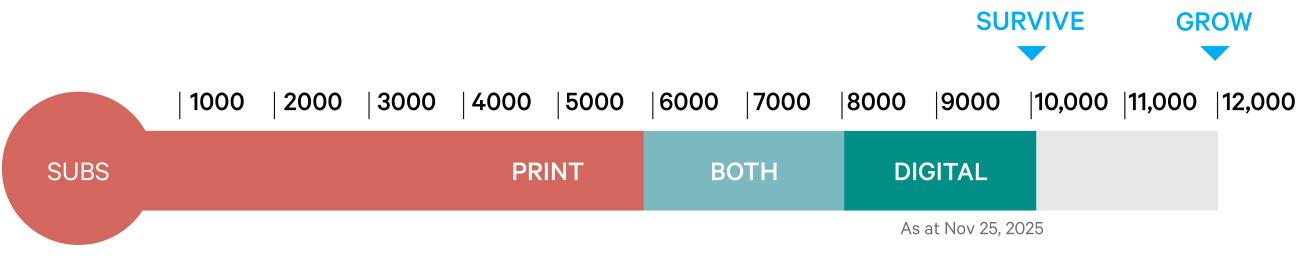 The significance of this support isn’t lost on us. The observant among you will have noticed that the subscription thermometer graphic has been firmly stuck on 10,000. That means two things: Readers are renewing last year’s expiring subs like crazy—thank you—but we’re not winning enough new subscriptions to get us to 12,000, the notch on the thermometer that allows us to hire another journalist and double our story output.