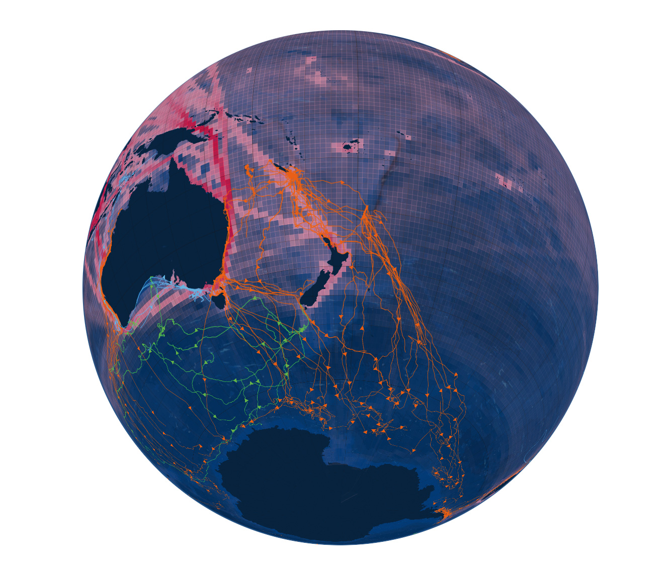 Here, we’ve focused on humpback whales, tracked in orange, and southern right whales, in green. Then we’ve highlighted “shipping and vessel strikes”—that’s the pink haze—to show the degree to which our whales’ traditional migration routes align with shipping lanes.